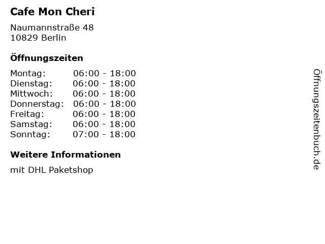 | Öffnungszeiten Cafe Mon Cheri in Berlin anzeigen | |