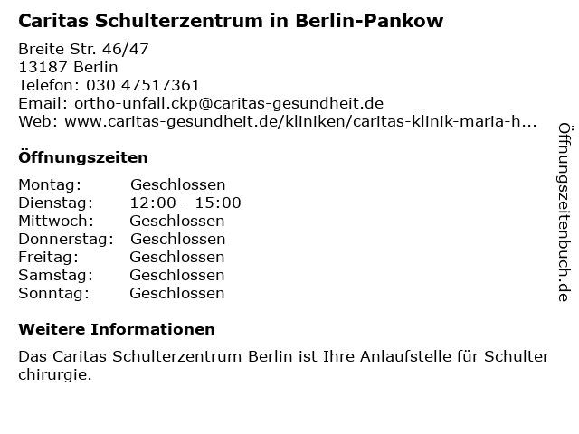 1 Zentrale Notaufnahme | Rettungsstelle | Caritas-Klinik Maria Heimsuchung Berlin-Pankow (Entfernung: 0,00 km) Breite Str. 46/47, 13187 Berlin 2 Gastroenterologie & Diabetologie | Innere Medizin | Caritas-Klinik Maria Heimsuchung Berlin-Pankow (Entfernung: 0,00 km) Breite Str. 46/47, 13187 Berlin 4 Gynäkologie | Caritas-Klinik Maria Heimsuchung Berlin-Pankow (Entfernung: 0,00 km) Breite Str. 46/47, 13187 Berlin 5 6 Anästhesie, Intensiv- und Notfallmedizin | Caritas-Klinik Maria Heimsuchung Berlin-Pankow (Entfernung: 0,00 km) Breite Str. 46/47, 13187 Berlin |