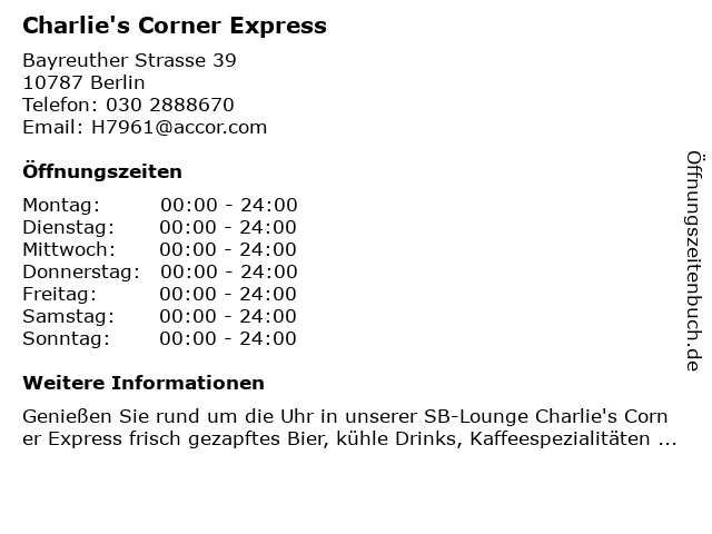 | Öffnungszeiten Charlie's Corner Express in Berlin anzeigen | |