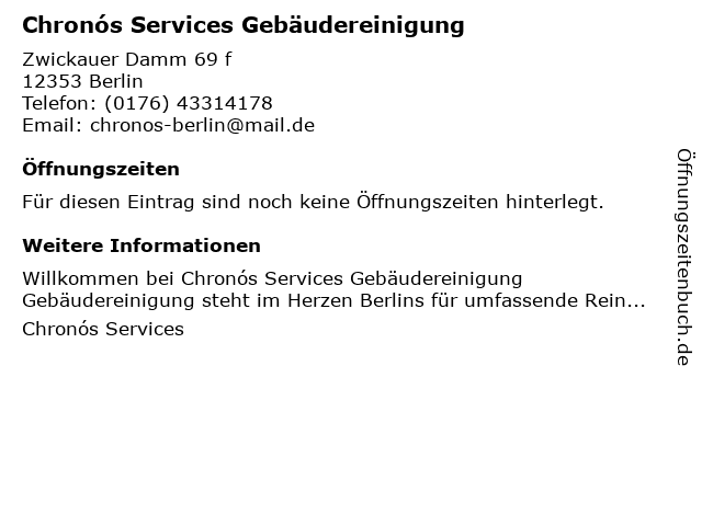 1 SFT Berlin Reinigungsdienst | Gebäudereinigung | Entrümpelung | Winterdienst | Gartenpflege | Hausmeisterservice (Entfernung: 0,35 km) Theodor-Loos-Weg 33, 12353 Berlin 4 Active-Clean 24 Meisterbetrieb für Gebäudereinigung in Berlin (Entfernung: 3,68 km) Usedomstr. 38, 12524 Berlin 6 |
