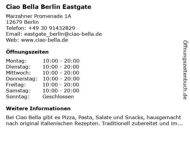 | Öffnungszeiten Ciao Bella Berlin Eastgate in Berlin anzeigen | |