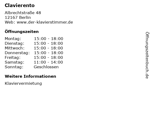 | Öffnungszeiten Clavierento in Berlin anzeigen | |