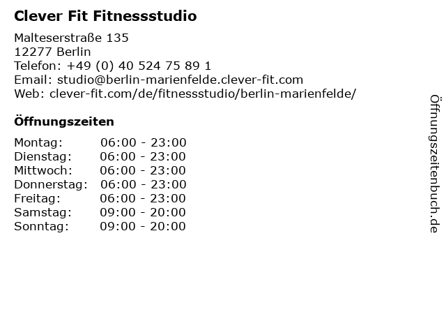 | Öffnungszeiten Clever Fit Fitnessstudio in Berlin anzeigen | |