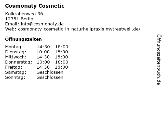 | Öffnungszeiten Cosmonaty Cosmetic in Berlin anzeigen | |