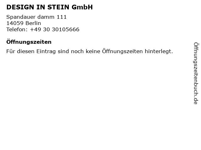 | Öffnungszeiten DESIGN IN STEIN GmbH in Berlin anzeigen | |