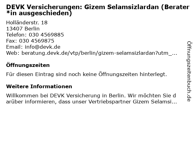 1 DEVK Versicherungen: Gizem Selamsizlardan (Berater*in ausgeschieden) (Entfernung: 1,34 km) Müllerstr. 115, 13349 Berlin 6 |