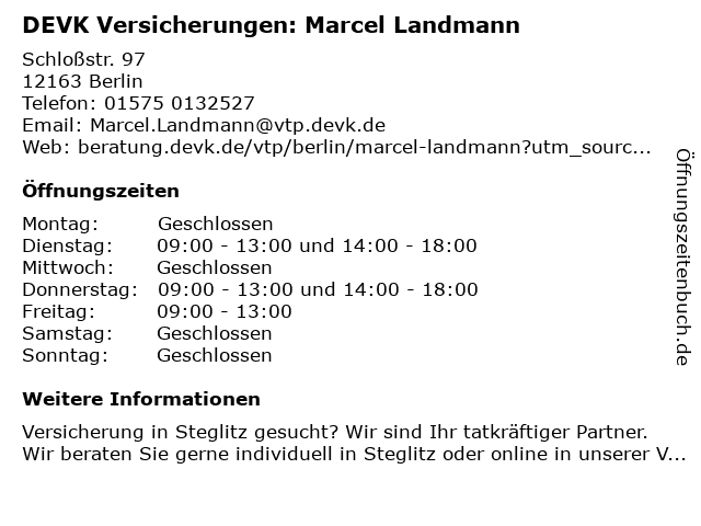 1 Marcel Schüle - Schlüsseldienst & Sicherheitstechnik (Entfernung: 0,67 km) Schloßstr. 67, 12165 Berlin Steglitz 4 DEVK Versicherung: Ahmad Hallak (Berater*in ausgeschieden) (Entfernung: 3,48 km) Morgensternstr. 29, 12207 Berlin 6 |