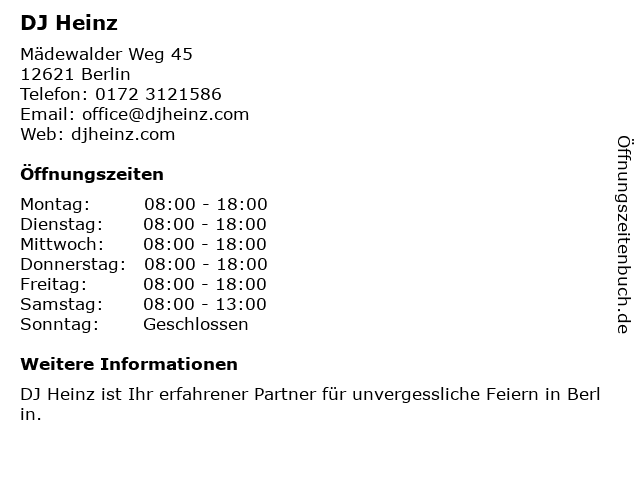 Öffnungszeiten DJ Heinz in Berlin anzeigen | |