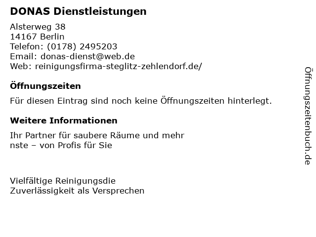 | Öffnungszeiten DONAS Dienstleistungen in Berlin anzeigen | |