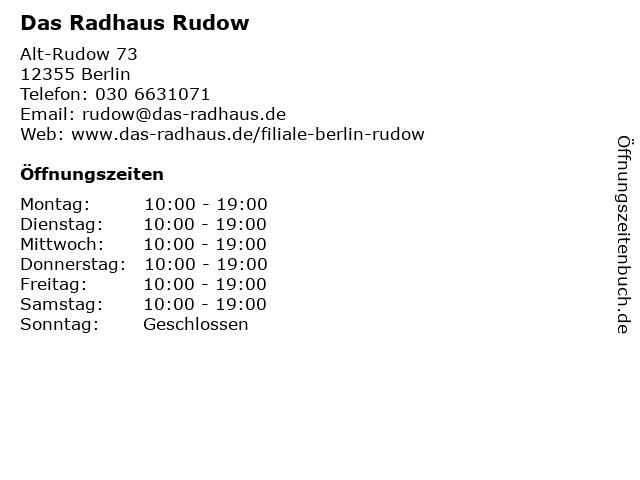 | Öffnungszeiten Das Radhaus Rudow in Berlin anzeigen | |
