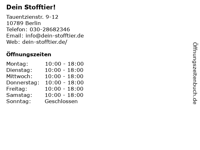 | Öffnungszeiten Dein Stofftier! in Berlin anzeigen | |
