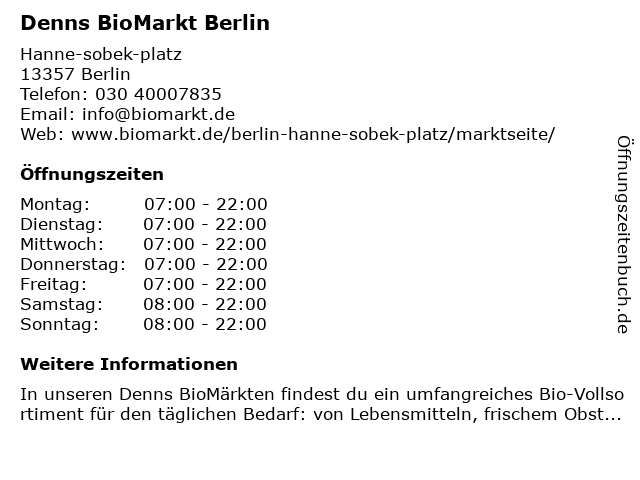 | Öffnungszeiten Denns BioMarkt Berlin in Berlin anzeigen | |