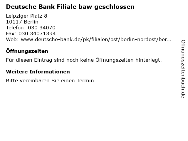 | Deutsche Bank Filiale baw geschlossen anrufen | |