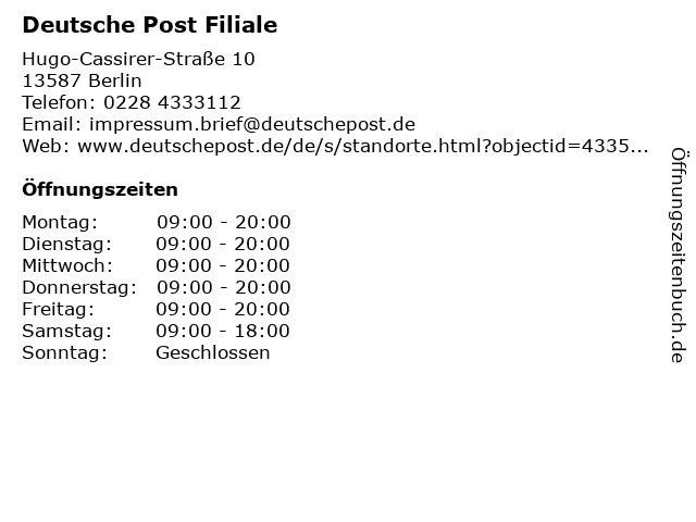 Deutsche Post Filiale in Berlin | Telefonnummer, Öffnungszeiten und Adresse