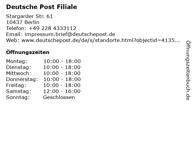 Deutsche Post Filiale in Berlin | Telefonnummer, Öffnungszeiten und Adresse