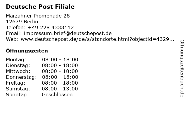 | Öffnungszeiten Deutsche Post Filiale in Berlin anzeigen | |
