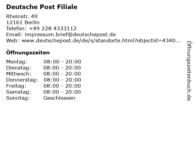 Deutsche Post Filiale in Berlin | Telefonnummer, Öffnungszeiten und Adresse