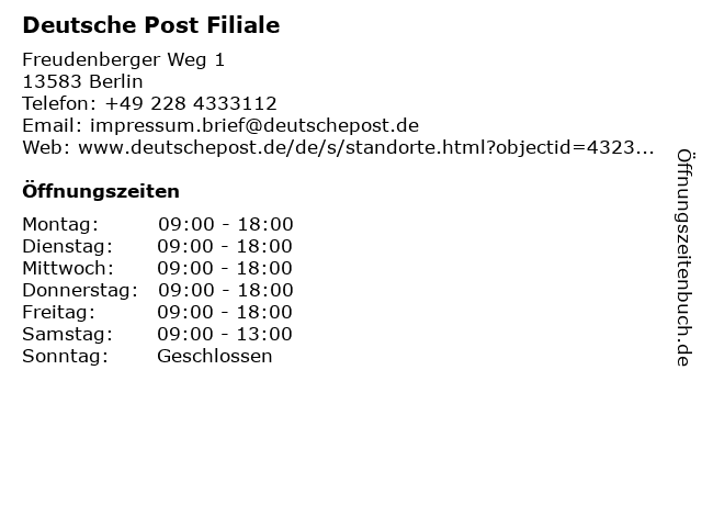 | Öffnungszeiten Deutsche Post Filiale in Berlin anzeigen | |