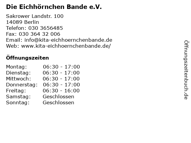 | Öffnungszeiten Die Eichhörnchen Bande e.V. in Berlin anzeigen | |