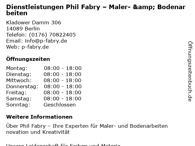 1 4 maler zeit potsdam personalleasing gmbh (Entfernung: 10,25 km) Eduard-von-Winterstein-Str. 22, 14480 Potsdam 5 Royal Paint Malerbetrieb Maler- & Lackierermeister Heiko Baranek (Entfernung: 10,85 km) Spandauer Straße 192, 14612 Falkensee 6 |