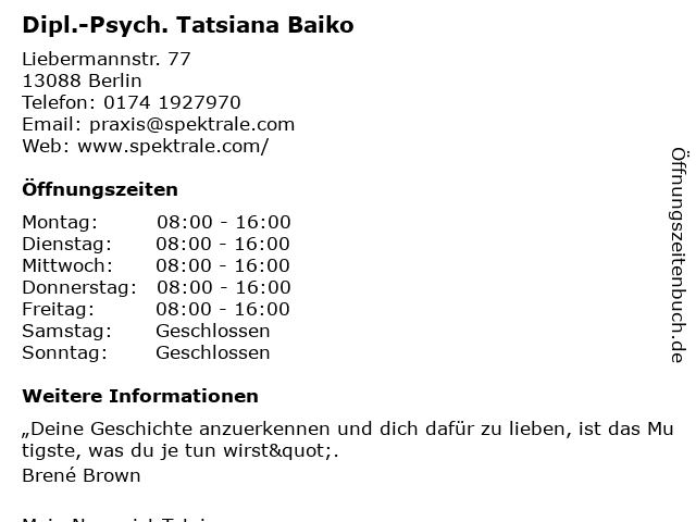| Öffnungszeiten Dipl.-Psych. Tatsiana Baiko in Berlin anzeigen | |