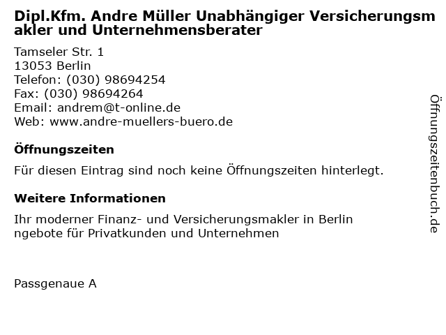 | Dipl.Kfm. Andre Müller Unabhängiger Versicherungsmakler und Unternehmensberater anrufen | |