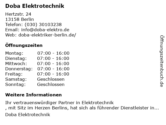 | Öffnungszeiten Doba Elektrotechnik in Berlin anzeigen | |