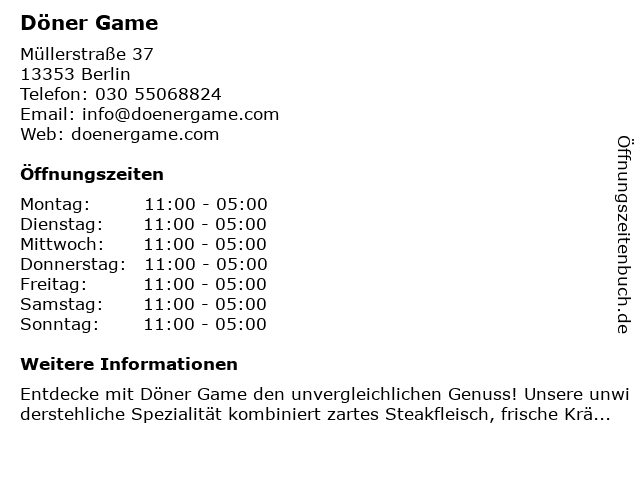 | Öffnungszeiten Döner Game in Berlin anzeigen | |