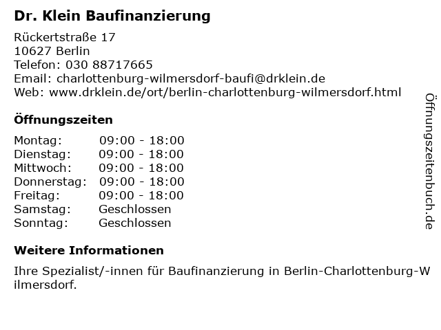 | Öffnungszeiten Dr. Klein Baufinanzierung in Berlin anzeigen | |