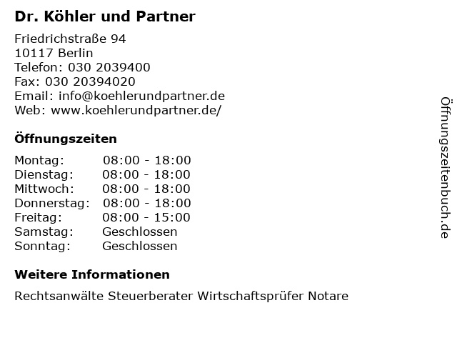 | Öffnungszeiten Dr. Köhler und Partner in Berlin anzeigen | |