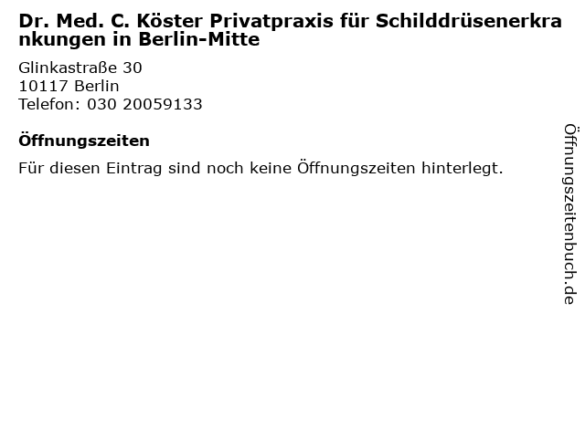 | Dr. Med. C. Köster Privatpraxis für Schilddrüsenerkrankungen in Berlin-Mitte anrufen | |