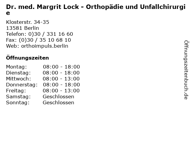 Branchen & Suchbegriffe zu Dr. med. Margrit Lock - Orthopädie und Unfallchirurgie:dr., lock, margrit, med., medizin, orthopädie, sprechzeiten, unfallchirurgie |