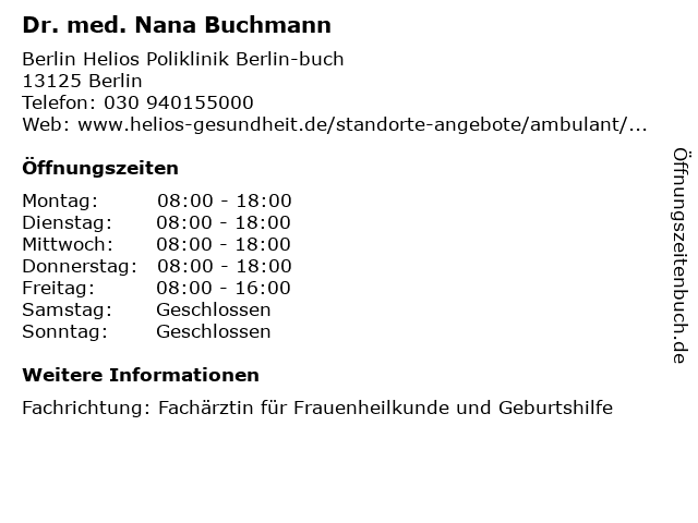 | Öffnungszeiten Dr. med. Nana Buchmann in Berlin anzeigen | |