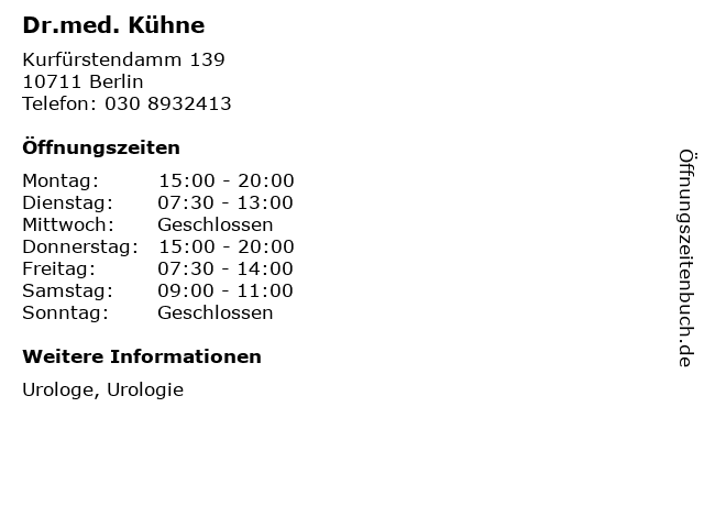 | Öffnungszeiten Dr.med. Kühne in Berlin anzeigen | |