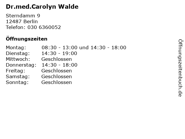 | Öffnungszeiten Dr.med.Carolyn Walde in Berlin anzeigen | |