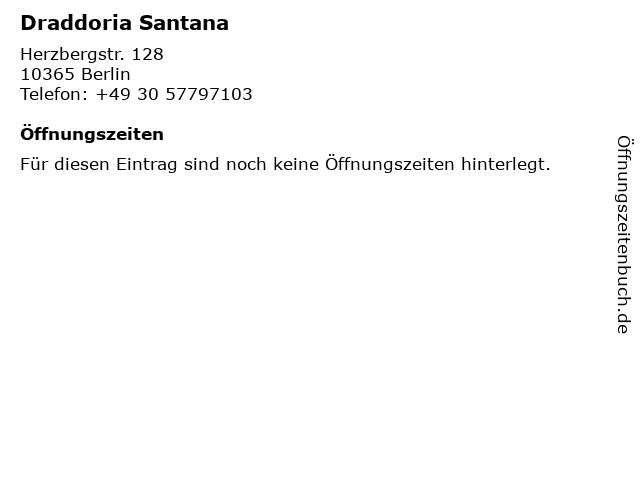 | Öffnungszeiten Draddoria Santana in Berlin anzeigen | |