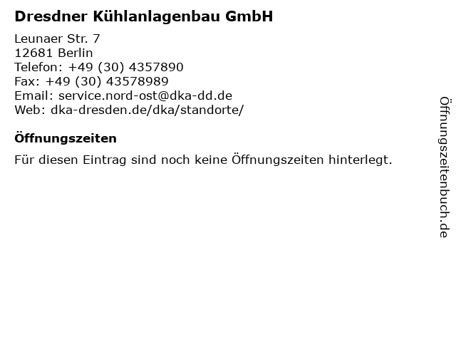 | Öffnungszeiten Dresdner Kühlanlagenbau GmbH in Berlin anzeigen | |