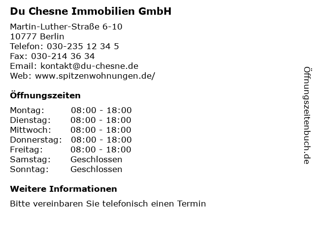 | Öffnungszeiten Du Chesne Immobilien GmbH in Berlin anzeigen | |