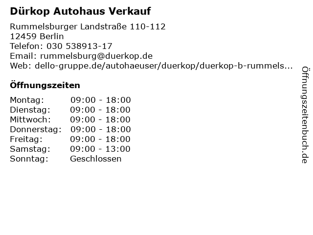 | Öffnungszeiten Dürkop Autohaus Verkauf in Berlin anzeigen | |