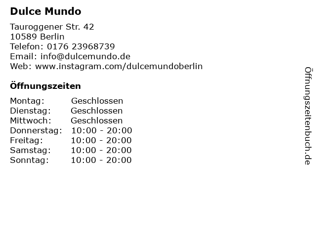 | Öffnungszeiten Dulce Mundo in Berlin anzeigen | |