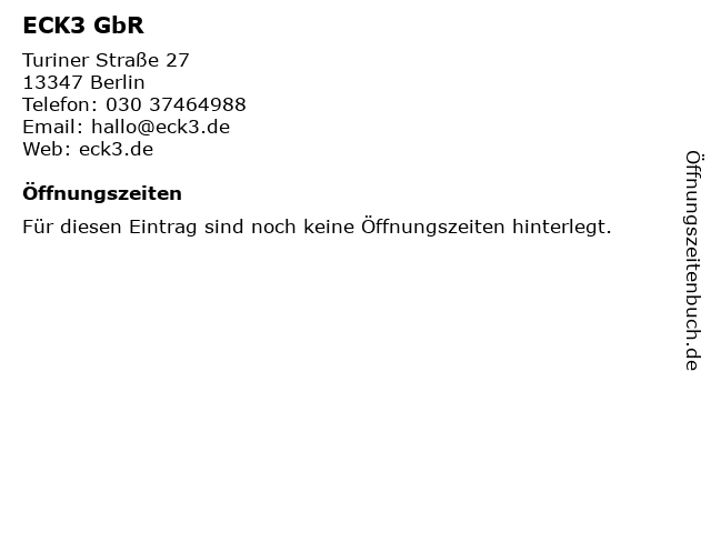 | Öffnungszeiten ECK3 GbR in Berlin anzeigen | |