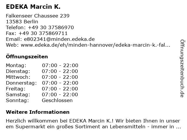 | Öffnungszeiten EDEKA Marcin K. in Berlin anzeigen | |