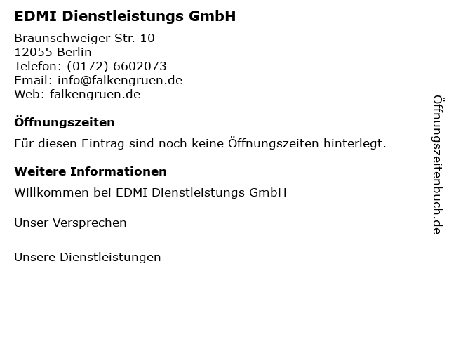| Öffnungszeiten EDMI Dienstleistungs GmbH in Berlin anzeigen | |