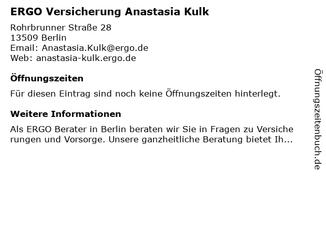 | Öffnungszeiten ERGO Versicherung Anastasia Kulk in Berlin anzeigen | |