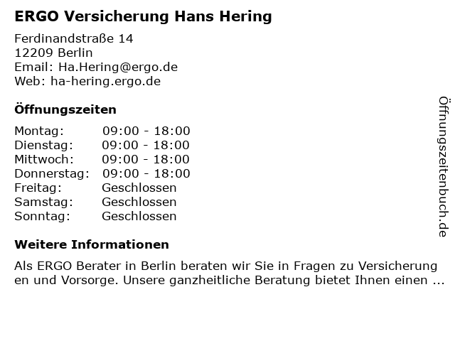 | Öffnungszeiten ERGO Versicherung Hans Hering in Berlin anzeigen | |