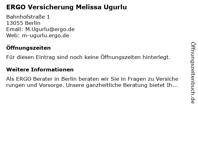 | Öffnungszeiten ERGO Versicherung Melissa Ugurlu in Berlin anzeigen | |