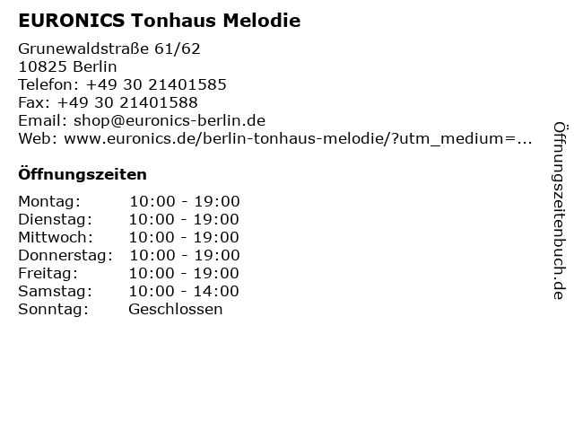 | Öffnungszeiten EURONICS Tonhaus Melodie in Berlin anzeigen | |