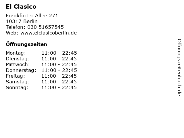| Öffnungszeiten El Clasico in Berlin anzeigen | |