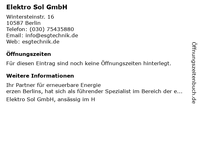 | Öffnungszeiten Elektro Sol GmbH in Berlin anzeigen | |