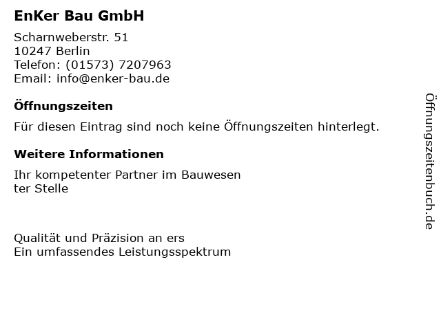| Öffnungszeiten EnKer Bau GmbH in Berlin anzeigen | |